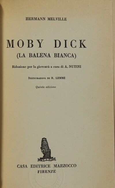 77. [Moby Dick, in Italian.] Moby Dick (la belena bianca). [Translated and abridged by Aurelia Nutini. Introduction by Paolo Reynaudo]. Firenze: Marzocco, [1957].