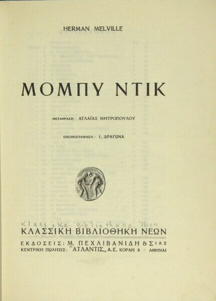 93. [Moby Dick, in Modern Greek.] Mompi Ntik. [Translated by Aglaias Mitropoulou]. Athens: Atlantis Publishing & Trading House Pechlivanidi S.A., n.d. [ca. 1960].