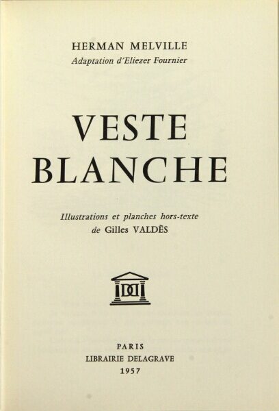 20. [White Jacket, in French.] Veste blanche ... Adaptation d'Éliézer Fournier ... Illustrations et planches hors-text de Gilles Valdès . Paris: Librairie Delagrave, 1957.